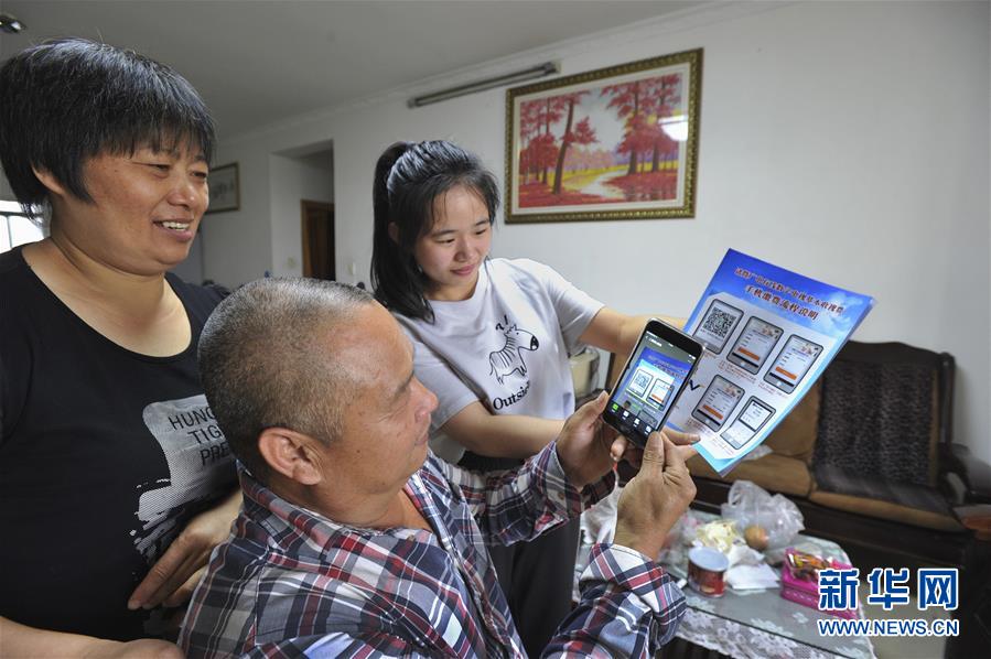 在浙江省诸暨市陶朱街道西湖村,一名代办员(右)上门指导村民楼明德夫妇使用手机交纳有线电视费(6月5日摄)。2018年1月,陶朱街道招录25名大学毕业生担任社区专职代办员,帮助村民办理诸暨市48项“一证通办”村级业务和街道12项民生业务。新华社发(徐德文 摄)