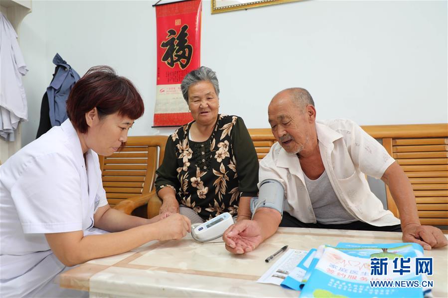 在山东省滨州市沾化区富源街道,社区卫生服务中心医生入户为村民检查身体(8月15日摄)。 新华社发(贾海宁 摄)