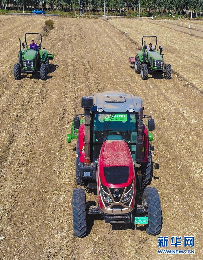 10月10日,在河北省深州市魏家桥镇唐家村,农机合作社社员驾驶农机在托管的土地上开展深松作业。 新华社记者 李晓果 摄