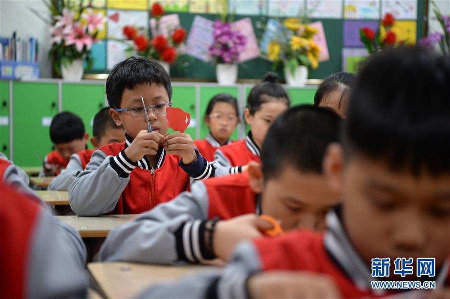 10月10日,哈尔滨市铁岭小学学生在校内课后服务课堂上练习剪纸。 新华社记者 王凯 摄