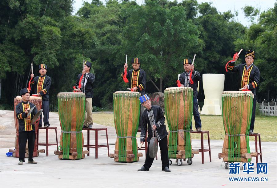 10月10日,在广西灵山县烟墩镇邓塘村烟墩大鼓传承基地,当地村民在表演烟墩大鼓。 烟墩大鼓是广西钦州市灵山县独特而古老的民间打击乐器,其外形高大厚实,制作技艺精巧,演奏方法独特,已被列入广西壮族自治区非物质文化遗产名录。近年来,灵山县为保护和传承烟墩大鼓,建立烟墩大鼓传承基地,培养烟墩大鼓传承人,取得良好效果,古老的非遗文化不断敲响乡村文化振兴的鼓点。 新华社记者陆波岸摄