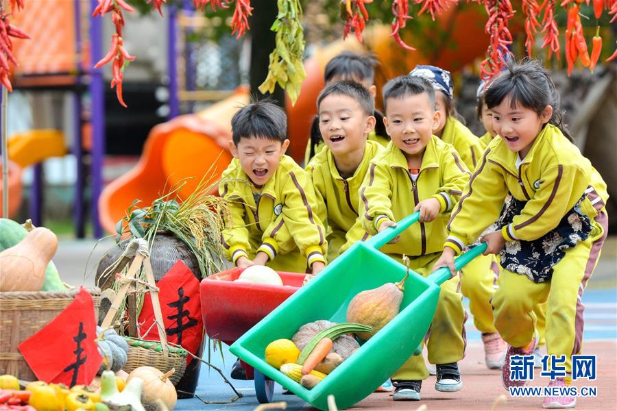 10月10日,孩子们手推独轮车搬运采收的农作物。当日,浙江省长兴县泗安镇中心幼儿园举行“晒秋”活动,老师和孩子们共同进行农作物的采收、晾晒等游戏,体验丰收晒秋的快乐。新华社发(谭云俸 摄)