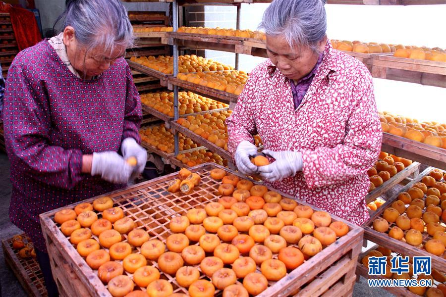 10月10日,在广西桂林恭城瑶族自治县恭城镇化育村,农民在加工柿饼。 新华社发(郑智敏 摄)