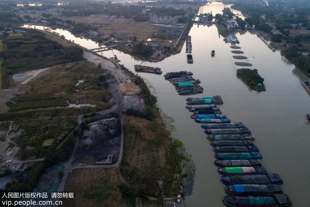 2018年10月10日,江苏省淮安市,京杭大运河淮阴船闸下游,大量的船只穿梭于运河之上。金秋十月,京杭大运河迎接一年中最繁忙运输季。贺敬华/人民图片