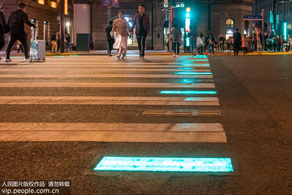 2018年10月10日,上海首条会发光人行道十一期间在外滩投入使用。当天傍晚在陈毅广场附近看到,南京东路与中山东一路交汇处的两侧人行道上,发光地砖的颜色与行人信号灯颜色同步变化:绿灯时,发光地砖显示为闪烁的绿色;红灯时,发光地砖则切换为红色。醒目的颜色能更好地提示行人,尤其可以提醒一些“低头族”不要闯红灯。