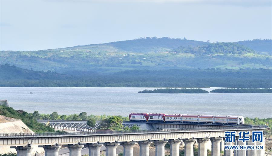 2017年5月29日,一列肯尼亚蒙内铁路测试列车行驶在蒙巴萨特大桥上。由中国承建的蒙巴萨-内罗毕标轨铁路(蒙内铁路)全长约480公里,于2017年5月通车。新华社记者 孙瑞博 摄