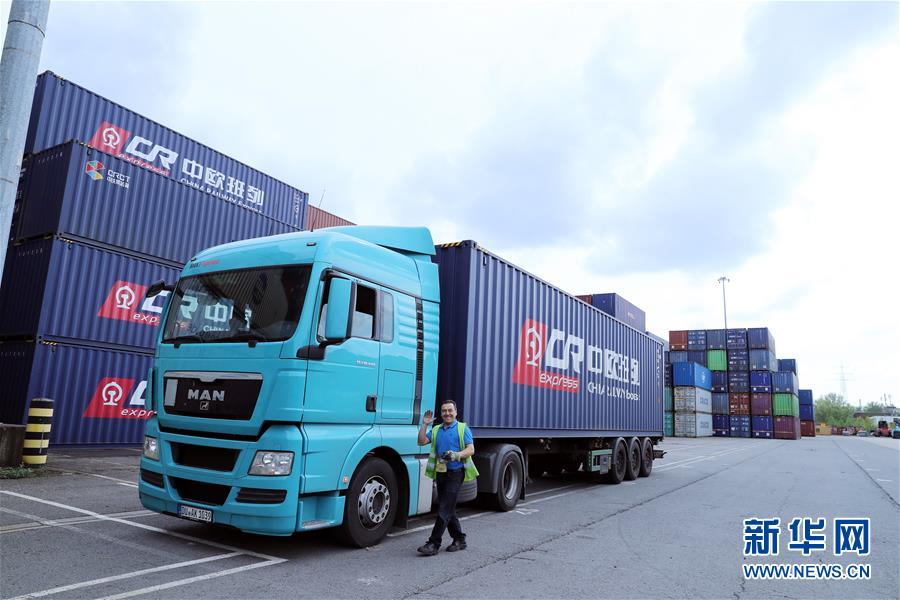 2018年4月16日在德国西部城市杜伊斯堡DIT货运场站拍摄的中欧班列集装箱。新华社记者 罗欢欢 摄