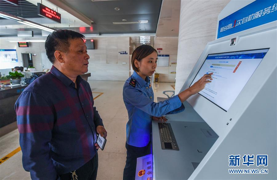 10月11日,织里镇行政服务中心的工作人员(右)在自助服务终端机上帮助一名商户办理工商营业执照。 近年来,浙江省湖州市织里镇积极出台多项新举措助力“最多跑一次”改革,先后梳理出“最多跑一次”清单事项325项,通过“网上办”“自助办”“区镇同权”“快递送达”“村社代办”等新方式打破了办事空间上的限制,提升了工作效率,完善了乡镇公共服务体系。 新华社记者 徐昱 摄