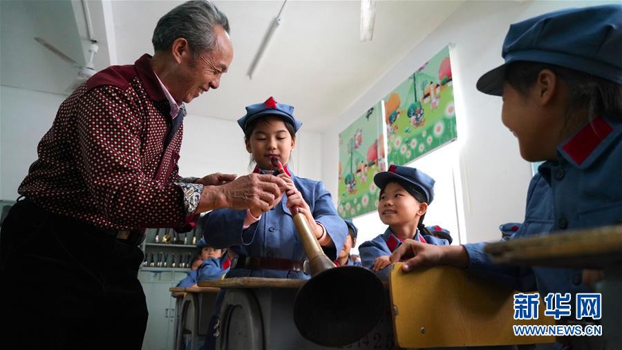 10月11日,肖卿华(左一)在指导一名小学生吹奏唢呐。 当日,江西省于都县长征源小学邀请国家级非物质文化遗产项目——于都唢呐“公婆吹”艺术传承人肖卿华和徒弟来校,现场演示唢呐制作过程以及吹奏技巧,让学生们近距离领略传统文化的独特魅力。 新华社记者 胡晨欢 摄
