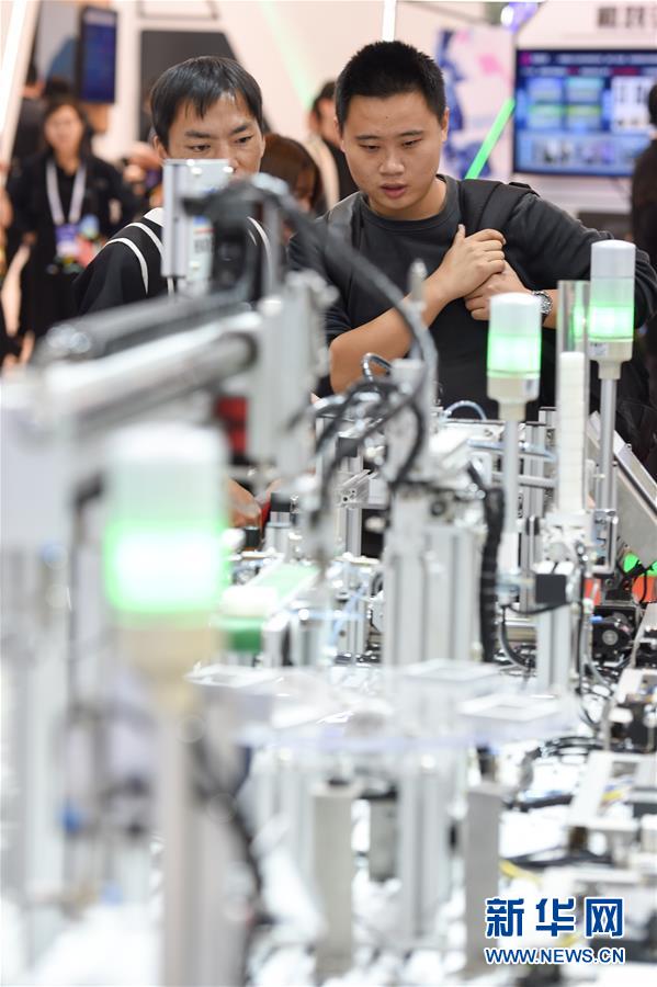 10月11日,观众在博览会现场观看模块化自动生产线。 当日,2018世界智能制造大会·智领全球博览会在南京国际博览中心开展。本次博览会以“赋能升级,智造未来”为主题,总展示面积约5万平方米,共有1900多家国内外企业参会参展。博览会将展示国内外智能制造领域的最新技术和顶尖产品,发布国内智能制造示范企业的最新发展成果,同时分享智能制造实际应用方面最前沿的解决方案。 新华社记者李博摄