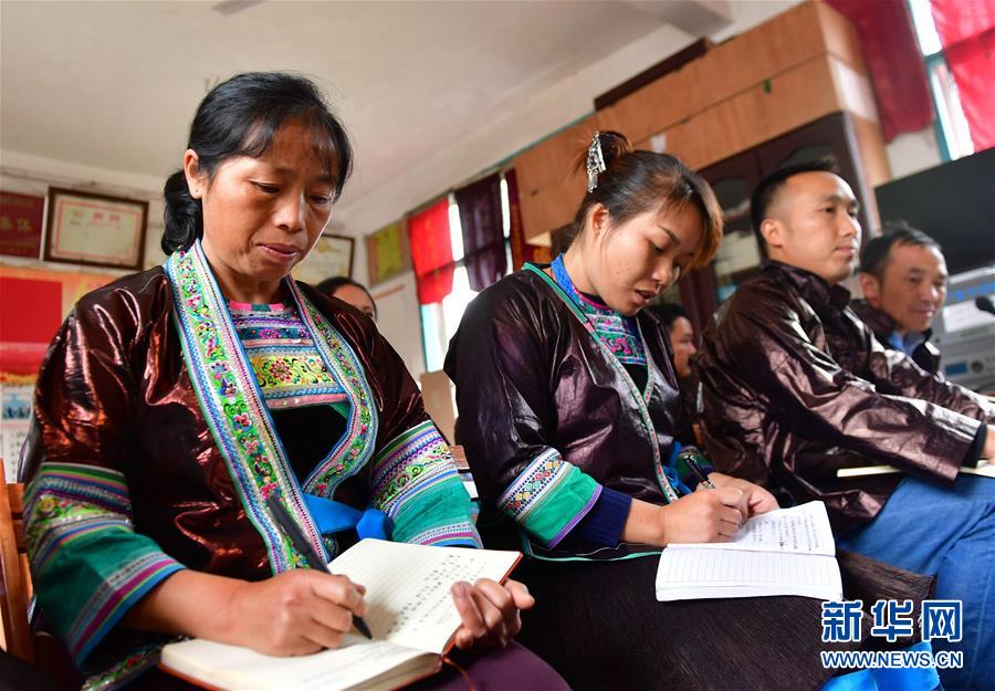 10月10日,党员群众在融水苗族自治县杆洞乡尧告村新时代讲习所学习。 今年以来,广西融水苗族自治县在乡镇、村(社区)创建226个“新时代讲习所”,聘请农业、扶贫等各领域专家及致富带头人任讲习员,向党员、群众宣讲党的十九大精神和乡村振兴、扶贫开发惠民政策等。 新华社记者 黄孝邦 摄