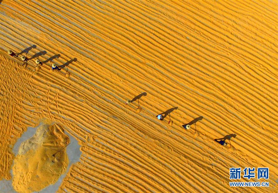 10月11日,在山东省临沂市平邑县一家种业基地,农民晾晒收获的玉米(无人机拍摄)。 新华社发(武纪全 摄)