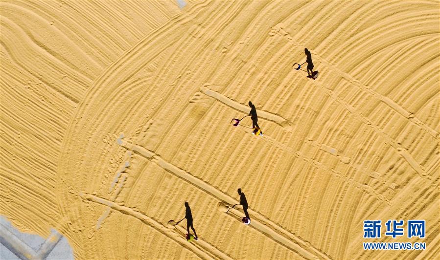 10月11日,在甘肃省张掖市甘州区一家小米种植专业合作社,农户晾晒收获的谷子(无人机拍摄)。 新华社发(王将 摄)