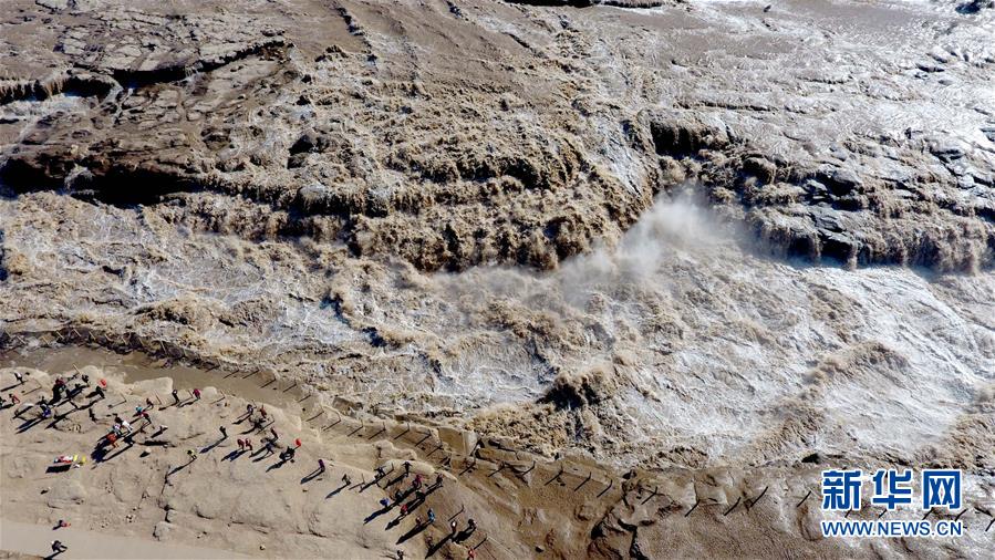 这是10月11日无人机拍摄的壶口瀑布。 近日,位于晋陕大峡谷的黄河壶口瀑布水量持续增大,主副瀑布连成数百米的大瀑布,形成“水岸齐平”景观。 新华社发(饶北成 摄)