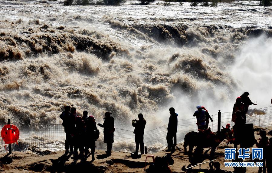 10月11日,游客在壶口瀑布参观。 近日,位于晋陕大峡谷的黄河壶口瀑布水量持续增大,主副瀑布连成数百米的大瀑布,形成“水岸齐平”景观。 新华社发(饶北成 摄)