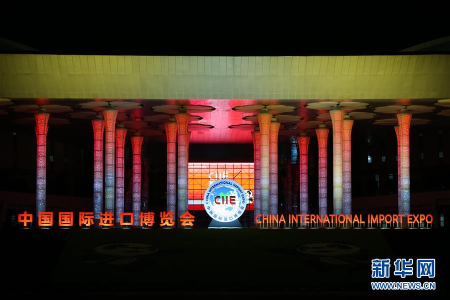 10月12日,中国国际进口博览会举办场地——国家会展中心(上海)南广场的灯光柱已亮起。 新华社记者 丁汀摄