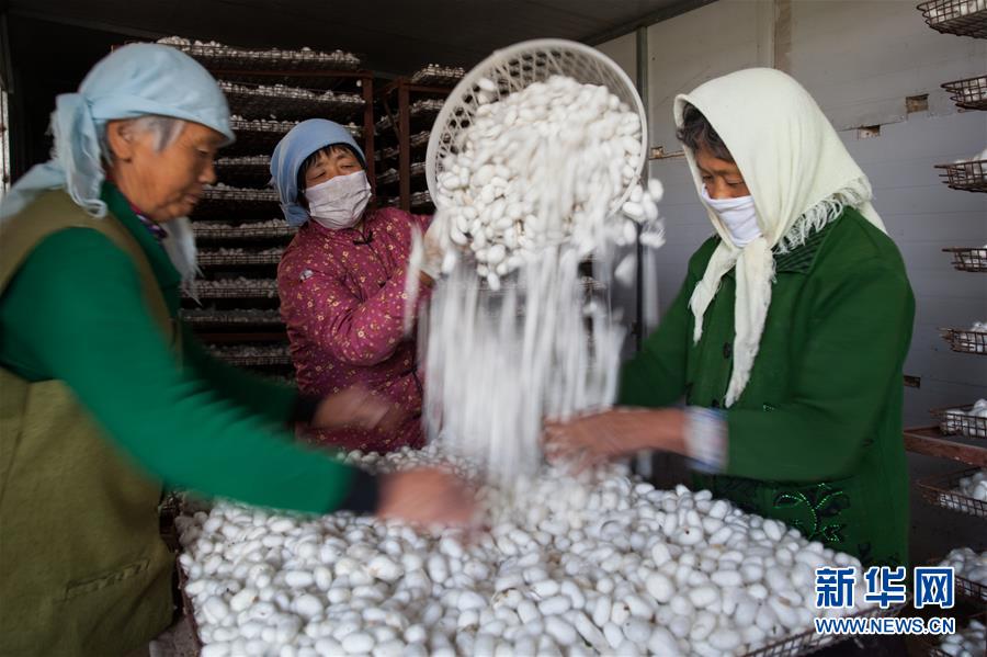 10月12日,在山东省高青县菁盛农业发展有限公司,工人准备加工蚕茧。新华社发(张维堂 摄)