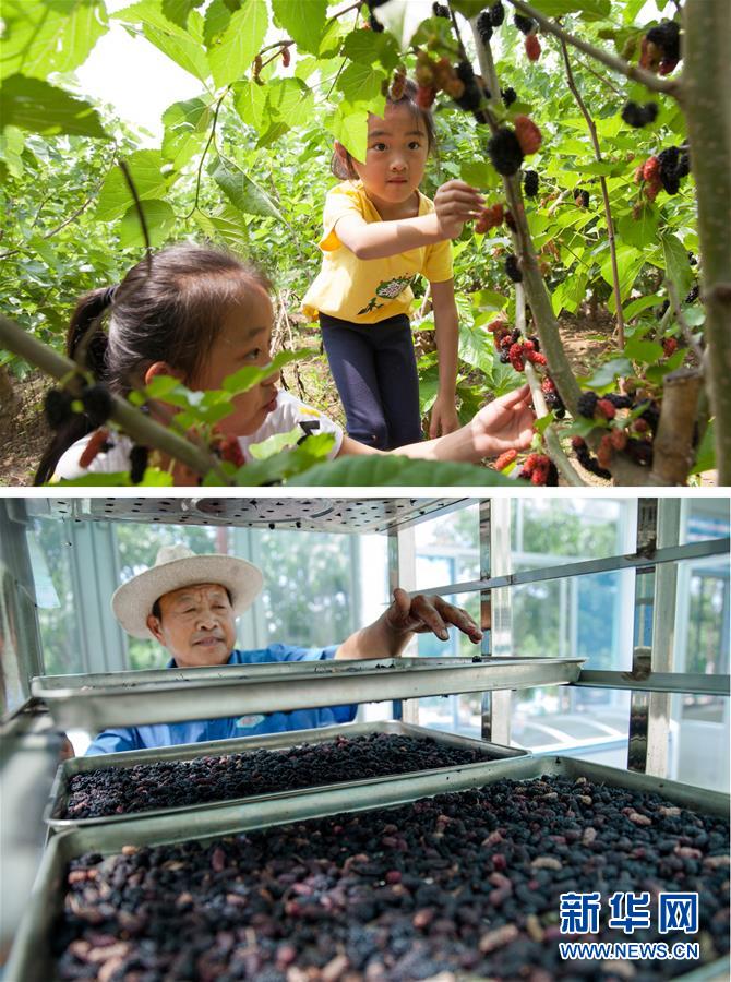 这是一张拼版照片。上图:两名小朋友在高青县常家镇老郑家庭农场采摘品尝桑葚鲜果(5月26日摄);下图:工人在高青县菁盛农业发展有限公司加工桑葚干(6月1日摄)。 新华社发(张维堂 摄)