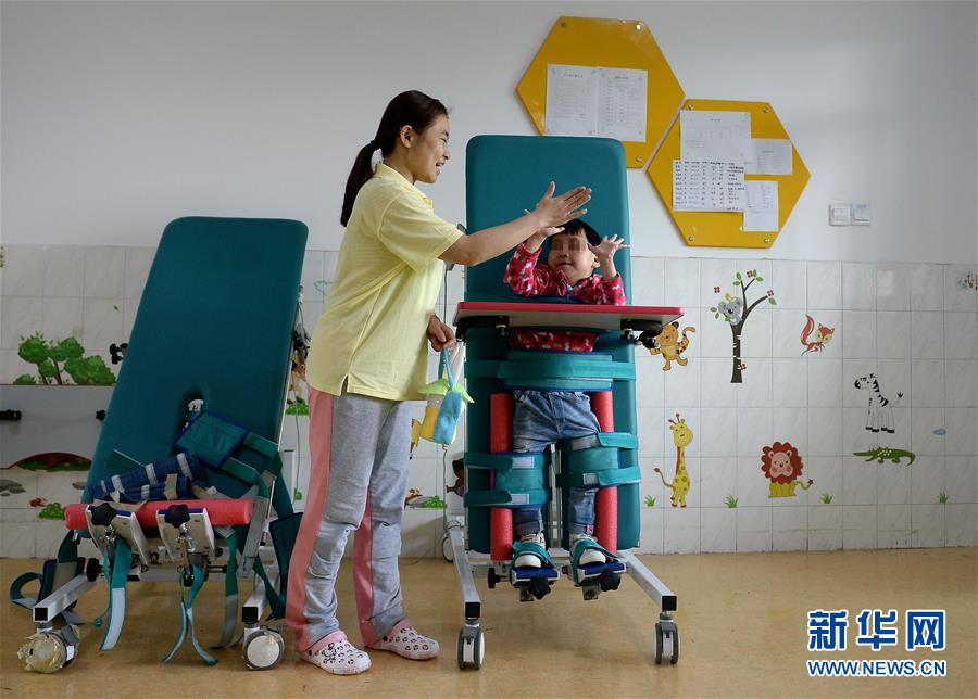 西安市儿童福利院阳光班白云组的老师在对一名中枢协调发育障碍的孩子进行站姿训练(5月11日摄)。 新华社记者 刘潇 摄