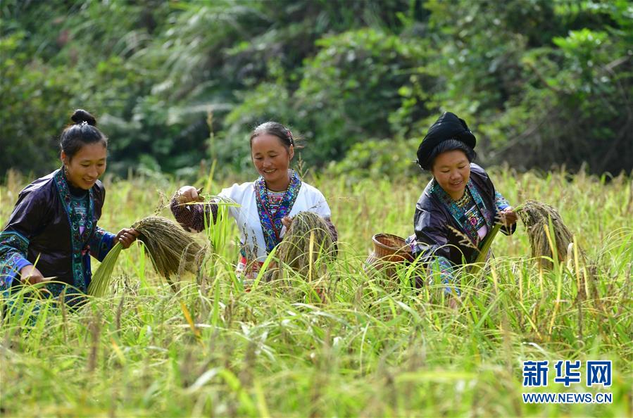 10月12日,在广西融水苗族自治县良寨乡大里村,苗家妇女在文化节上参加紫黑香糯收割比赛。新华社记者 黄孝邦 摄