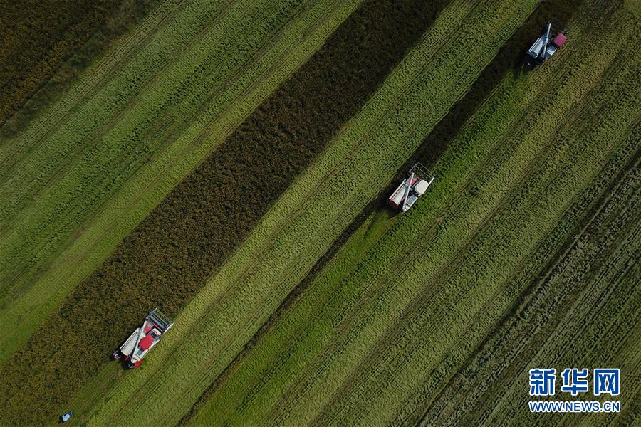 10月12日,浙江省湖州市吴兴区八里店镇尹家圩粮油植保农机专业合作社的农户使用联合收割机在稻田里进行收割作业(无人机拍摄)。 新华社记者黄宗治摄