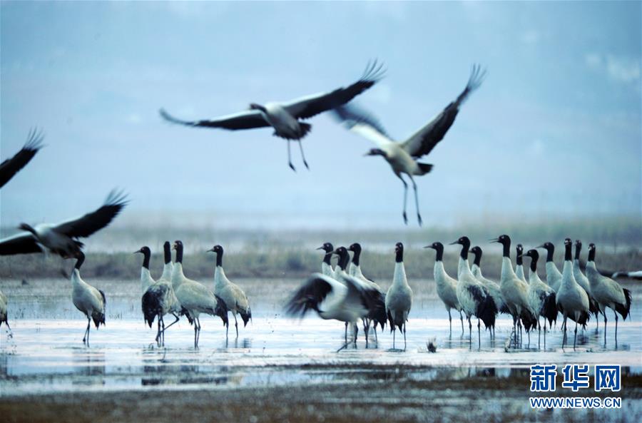 在贵州草海保护区越冬的国家一级保护动物黑颈鹤(3月9日摄)。