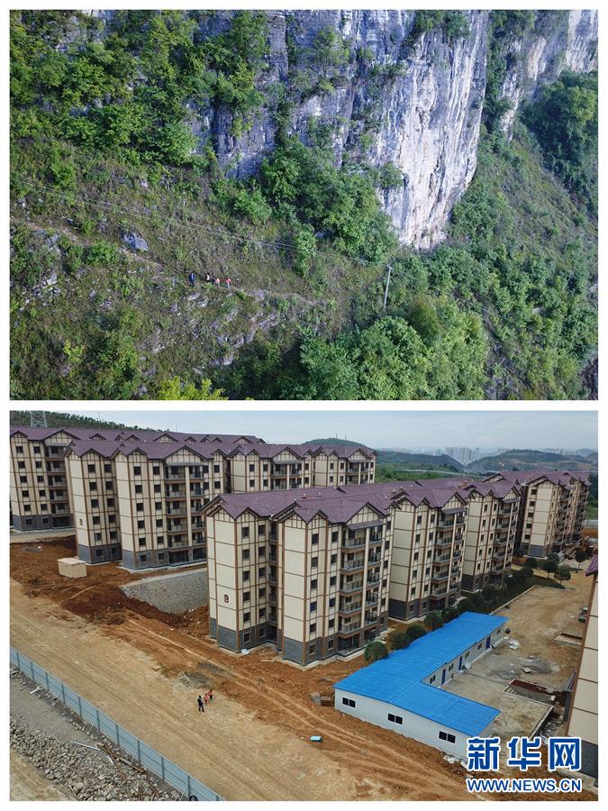 拼版照片:上图为贵州省毕节市黔西县金兰镇瓦房村哈冲组一景(4月27日摄);下图为哈冲组村民的新居——位于黔西县城的易地扶贫搬迁锦绣花都安置点(5月7日摄)。 新华社记者欧东衢摄