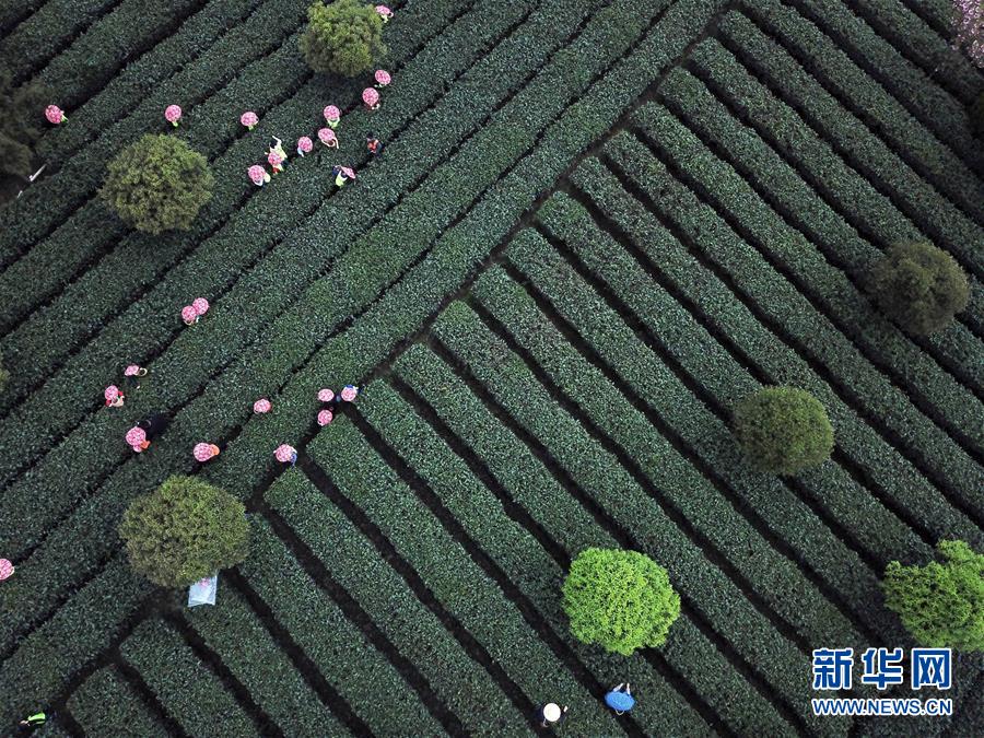 孩子们在贵州省遵义市湄潭县湄江街道核桃坝村体验采茶(4月1日无人机拍摄)。 新华社发(杨文斌 摄)