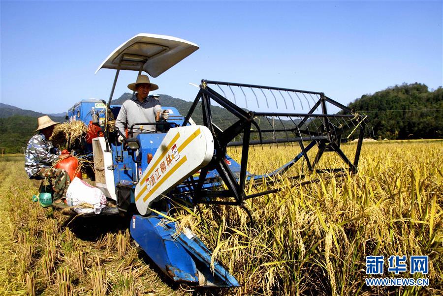 10月13日,农民驾驶农机在靖安县高湖镇古楠生态种养合作社“稻鸭共栖”基地田间收割有机水稻。 新华社发(徐仲庭 摄)