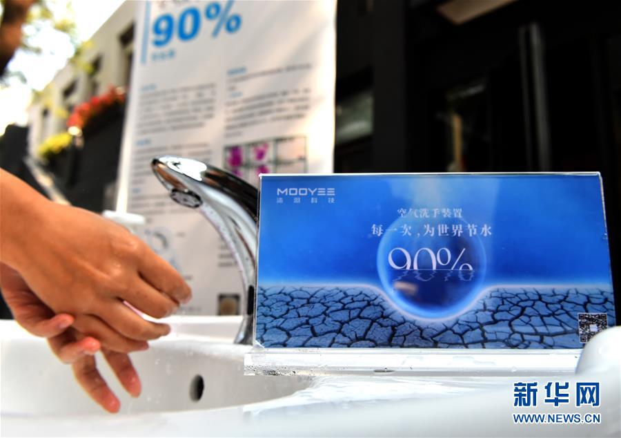 在国际创新集市上展示的一款空气洗手装置(10月13日摄)。 新华社记者罗晓光摄