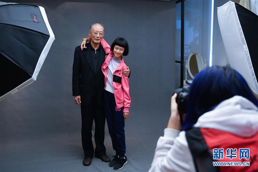 10月13日,在杭州市青少年活动中心少儿职业体验馆的摄影棚,小朋友瞿天予(中)与爷爷合影。 新华社记者 黄宗治 摄