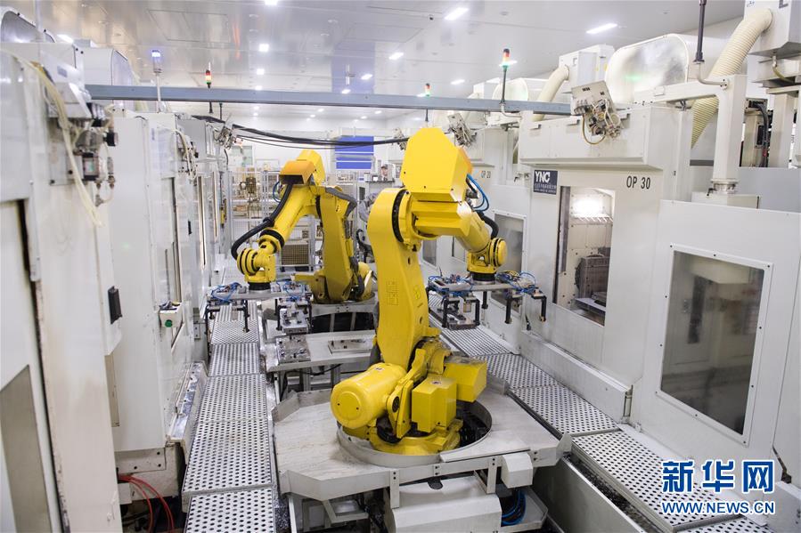 机器人在温州瑞安市瑞明集团智能化托盘线上搬运物料(1月16日摄)。在这条生产线上,1个工人可操纵4台机器人,轻松完成相当于以前30个工人的工作。 新华社记者翁忻旸摄