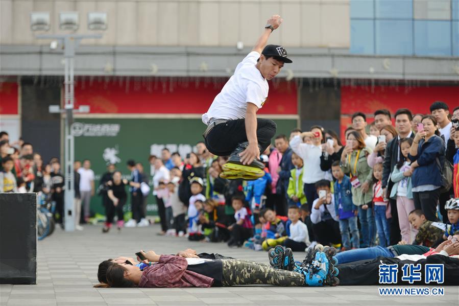 10月13日,几名轮滑爱好者在现场为市民展示轮滑技艺。 新华社发(杨素平 摄)