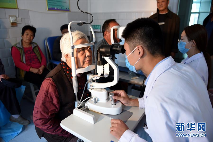 10月14日,在临沂市郯城县马头镇卫生院,眼科医生为一名老人做白内障检查。 新华社发(房德华 摄)