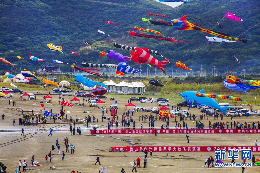 这是10月14日在浙江舟山鹿栏晴沙景区拍摄的风筝比赛活动现场。 新华社发(姚峰 摄)