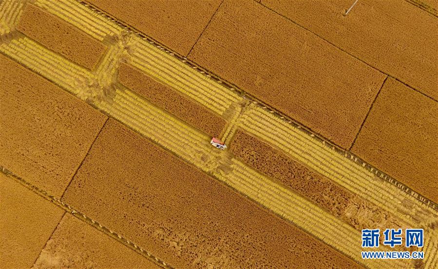 10月15日,河北省唐山市王滩镇的农民在使用机械设备收割水稻(无人机拍摄)。新华社记者 杨世尧 摄