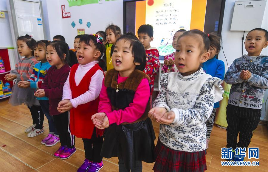 10月16日,在河北省大厂回族自治县城区第三幼儿园,孩子们在朗诵《悯农》。 当日是世界粮食日,河北省大厂回族自治县城区第三幼儿园组织开展了“爱惜粮食 从小做起”主题教育活动。 新华社记者 李晓果 摄