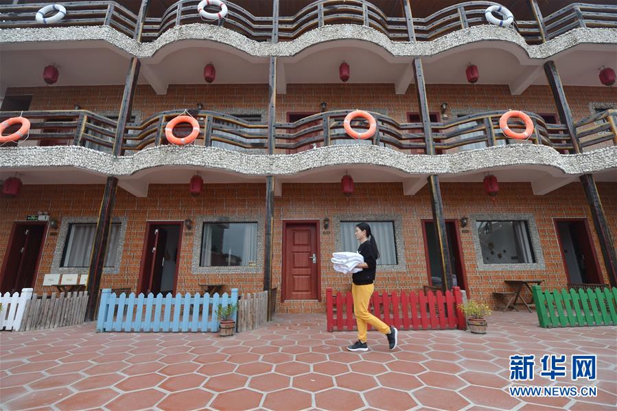 10月16日,在福建泉州晋江金井镇围头村,鲍鱼养殖户洪万亚在自家的民宿客栈准备换洗床单。 近年来,福建省晋江市一些沿海村庄利用独特的地理条件和产业基础,引入文化创意元素,推出诸如集装箱酒店、房车酒店、产业体验型民宿等特色体验项目,以多样化服务探索乡村特色民宿之路,形成了一些独具特色的沿海民宿特色村。 新华社记者 鲍菲菲 摄