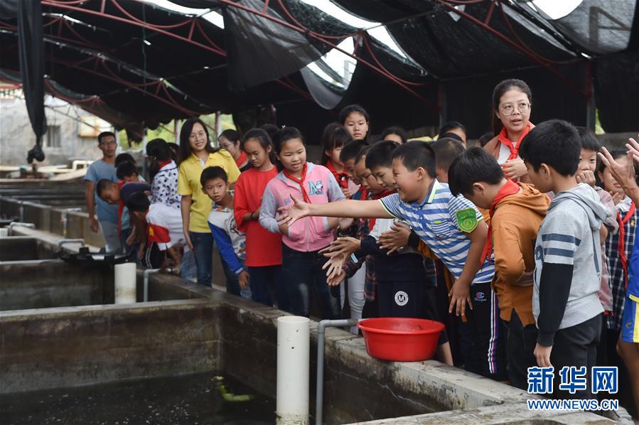 10月16日,在福建泉州晋江金井镇围头村一家鲍鱼养殖户经营的民宿客栈,小学生在产业体验区体验喂食鲍鱼。 近年来,福建省晋江市一些沿海村庄利用独特的地理条件和产业基础,引入文化创意元素,推出诸如集装箱酒店、房车酒店、产业体验型民宿等特色体验项目,以多样化服务探索乡村特色民宿之路,形成了一些独具特色的沿海民宿特色村。 新华社记者 林格 摄