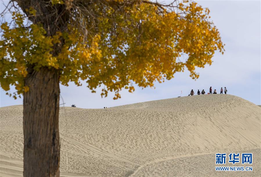 10月16日,在罗布人村寨,游客在沙脊上欣赏美景。新华社记者 赵戈 摄