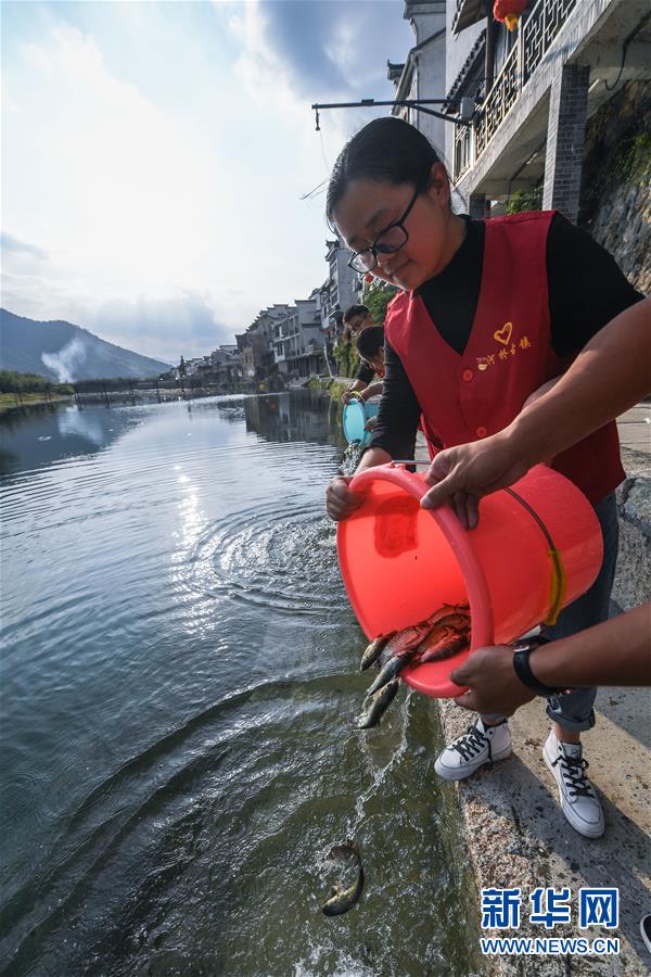 10月17日,河桥镇的青年党员们在镇边的昌南溪投放鱼苗。 近期,浙江省杭州市临安区河桥镇积极推进基层党建工作,组织青年党员成立乡村“护河队”,通过开展沿街发放宣传资料、定期清理沿河两岸卫生、投放鱼苗等一系列活动,广泛推动基层乡村“五水共治”,全面提升乡村河道水环境质量,助力美丽乡村建设。 新华社记者 徐昱 摄