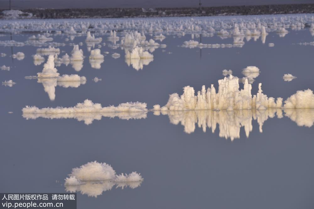 新疆玛纳斯盐湖位于准噶尔盆地的西北部,克拉玛依市白碱滩区东北70公里,距乌尔禾区38公里。盐湖面积约96平方公里,蕴藏着丰富的钾盐、钠盐、镁盐、硼、锂、溴等得天独厚的资源。9月盐池长出晶莹剔透的“盐花”,恰似一丛丛的冰雪花,美不胜收。/人民图片