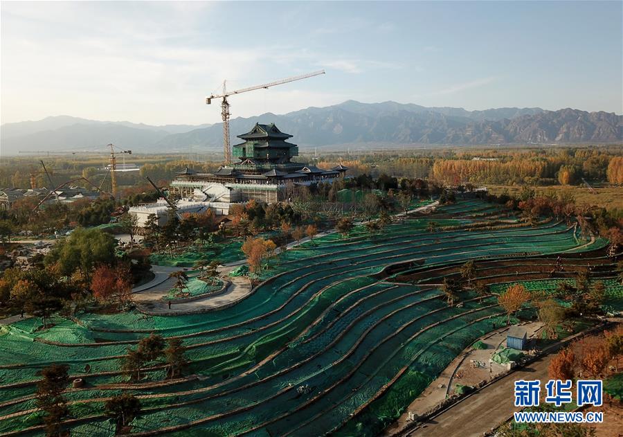 10月18日拍摄的建设中的北京世园会永宁阁(无人机拍摄)。 新华社记者 罗晓光 摄