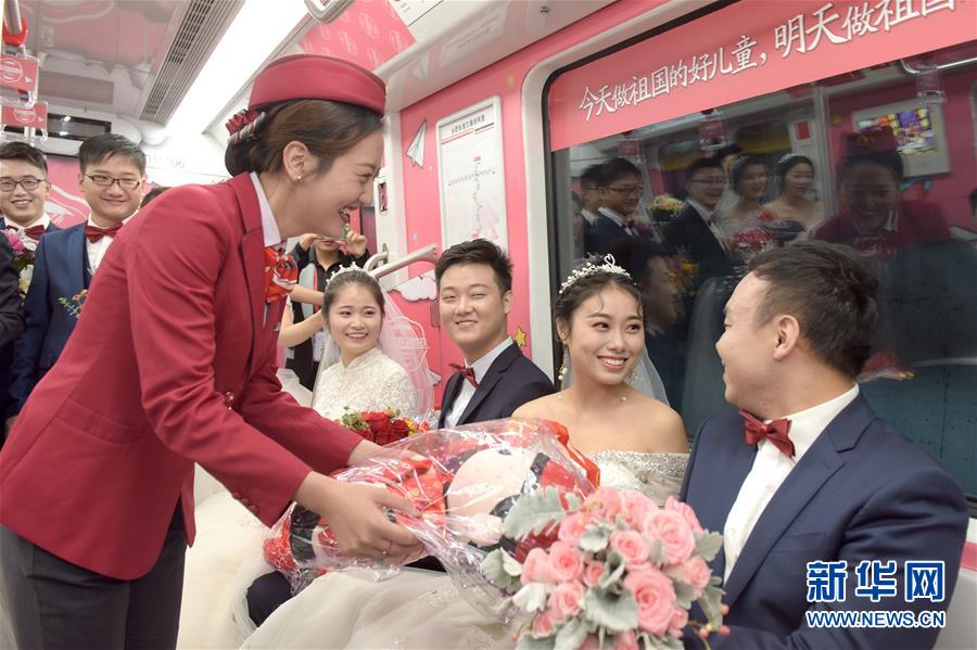 10月18日,在合肥市地铁一号线车厢内,地铁工作人员向新人们送礼物。当日,中铁四局集团城市轨道交通工程分公司的18对新人在安徽合肥地铁一号线的车厢里举行了一场集体婚礼仪式。 新华社记者 郭晨 摄