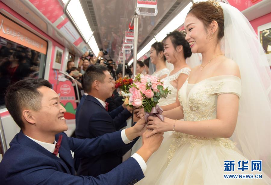 10月18日,在合肥市地铁一号线车厢内,新郎向新娘献花。 当日,中铁四局集团城市轨道交通工程分公司的18对新人在安徽合肥地铁一号线的车厢里举行了一场集体婚礼仪式。 新华社记者 郭晨 摄