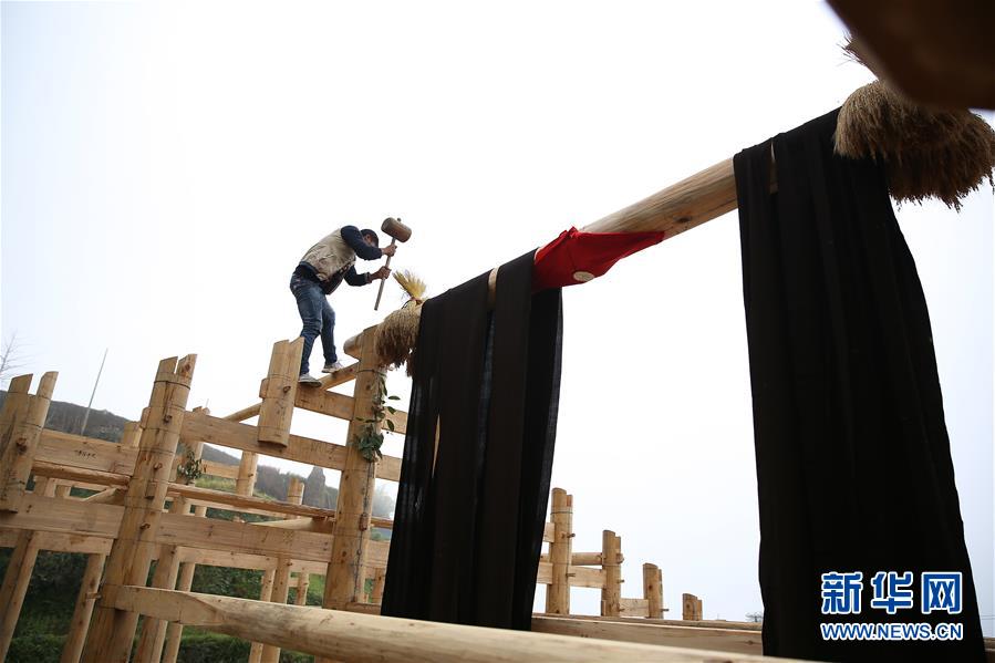 10月19日,在丹寨县排调镇排结村,村民在屋脊上固定安装好的大梁。 新华社发(黄晓海 摄)