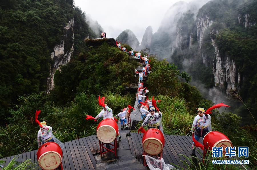 10月20日,在湘西土家族苗族自治州吉首市德夯天问台,苗族演员在进行表演苗鼓舞。 新华社发(姚方 摄)
