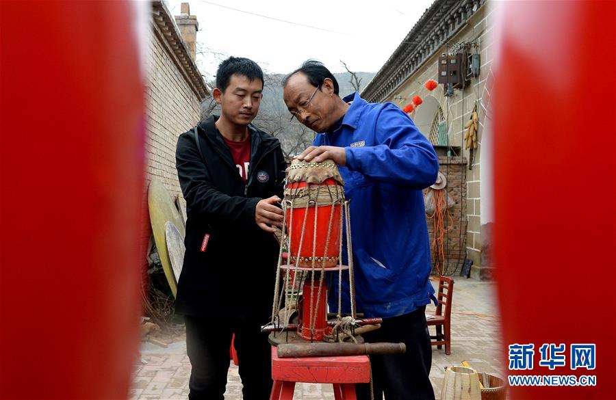 王永军(右)在指导儿子王涛给安塞腰鼓蒙皮(10月19日摄)。 新华社记者刘潇摄