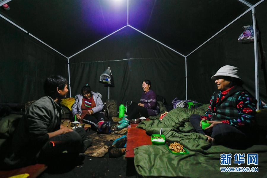 在西藏林芝市墨脱镇玛迪村临时救灾安置点,村民在帐篷中吃晚饭(10月20日摄)。墨脱镇玛迪村临时救灾安置点设置在远离江边的山坡上,共有12顶帐篷,约150人在此居住。 新华社记者 刘东君 摄