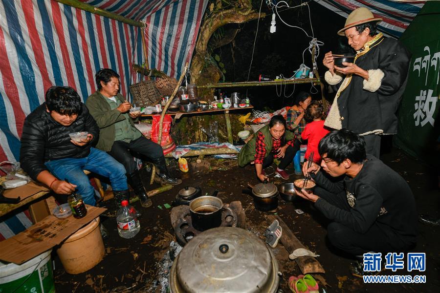 在西藏林芝市墨脱镇玛迪村临时救灾安置点,村民在临时厨房吃晚饭(10月20日摄)。墨脱镇玛迪村临时救灾安置点设置在远离江边的山坡上,共有12顶帐篷,约150人在此居住。 新华社记者 刘东君 摄